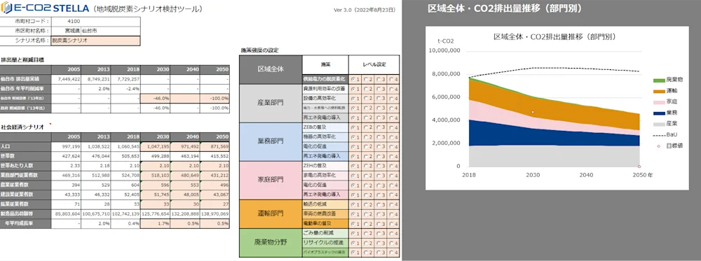 全基礎自治体の脱炭素シナリオ検討ツール「エコツー・ステラ」。全ての自治体について、エネルギー種・部門別に詳細な推計を行っており、自治体ごとの主要な排出源が一目でわかる。