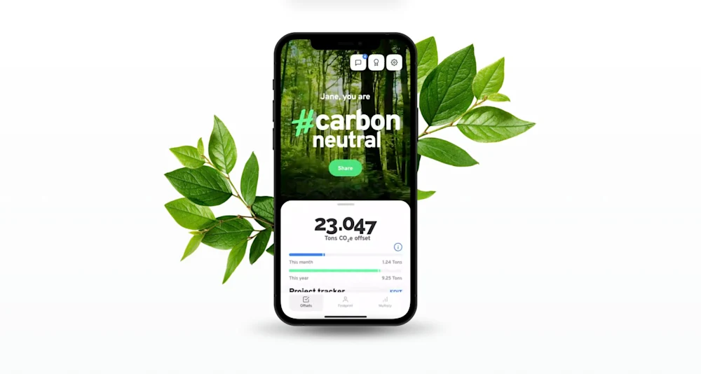 洗練されたUXで手軽にカーボンオフセットができるサブスクリプションサービス。飛行機に乗る頻度や食生活、再生可能エネルギーを利用しているかなど、簡単な質問からユーザーのCO2排出量を算出。排出量は月額料金に換算され、相殺するための環境プロジェクトへの投資が行えます。また、取引後は、オフセットにより何本の木が植えられたかなど、オフセットが環境に及ぼした影響を「見える化」し、ソーシャルメディアで共有できるのも特長です。